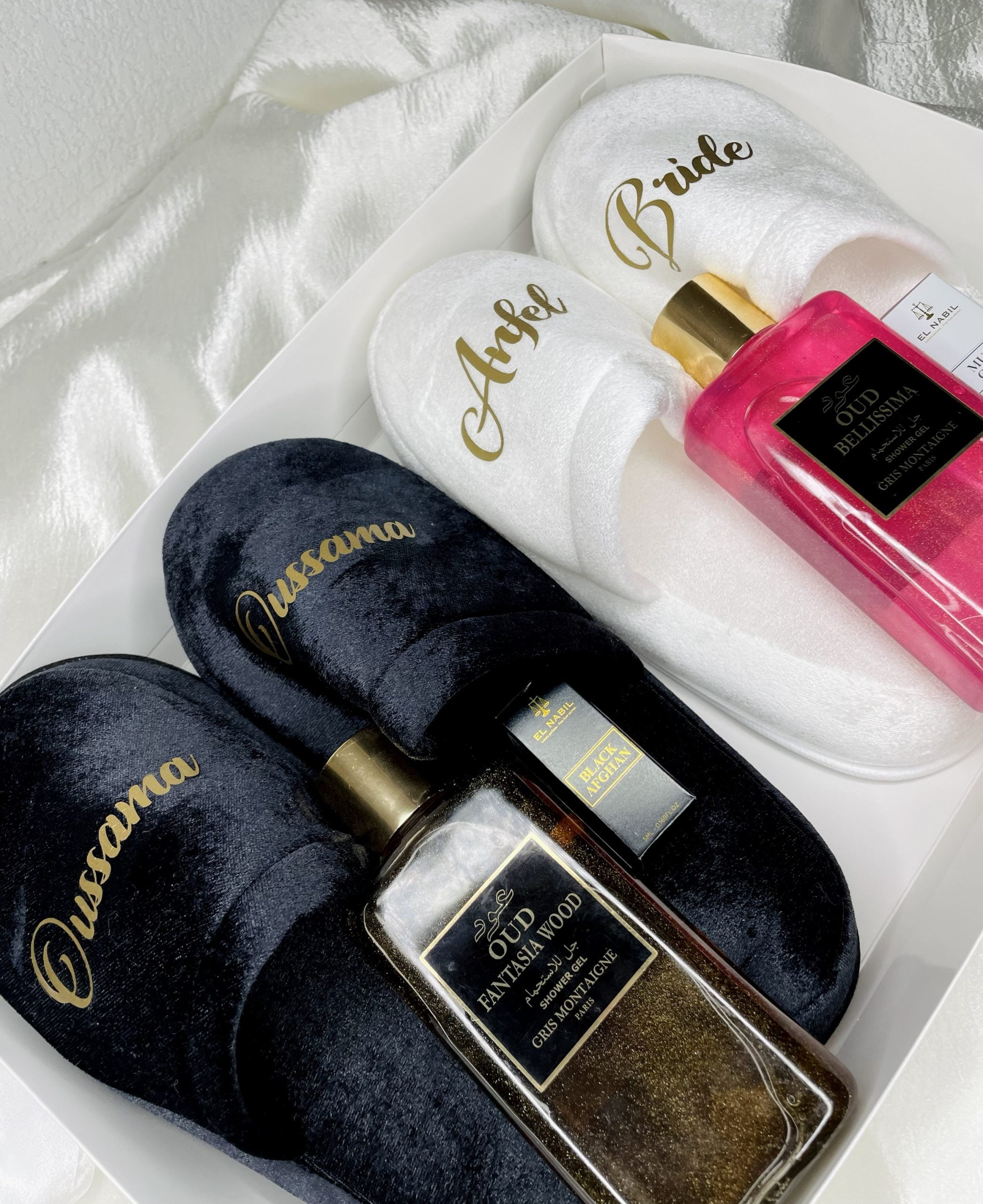 Offrez à votre couple préféré une expérience de bien-être inégalée avec notre coffret cadeau exclusif. Ce coffret élégant réunit une paire de chaussons personnalisés pour homme et femme, ainsi qu’une combinaison de gel douche d’oud et de musc. C’est l’occasion parfaite de partager des moments de détente et de créer des souvenirs mémorables.